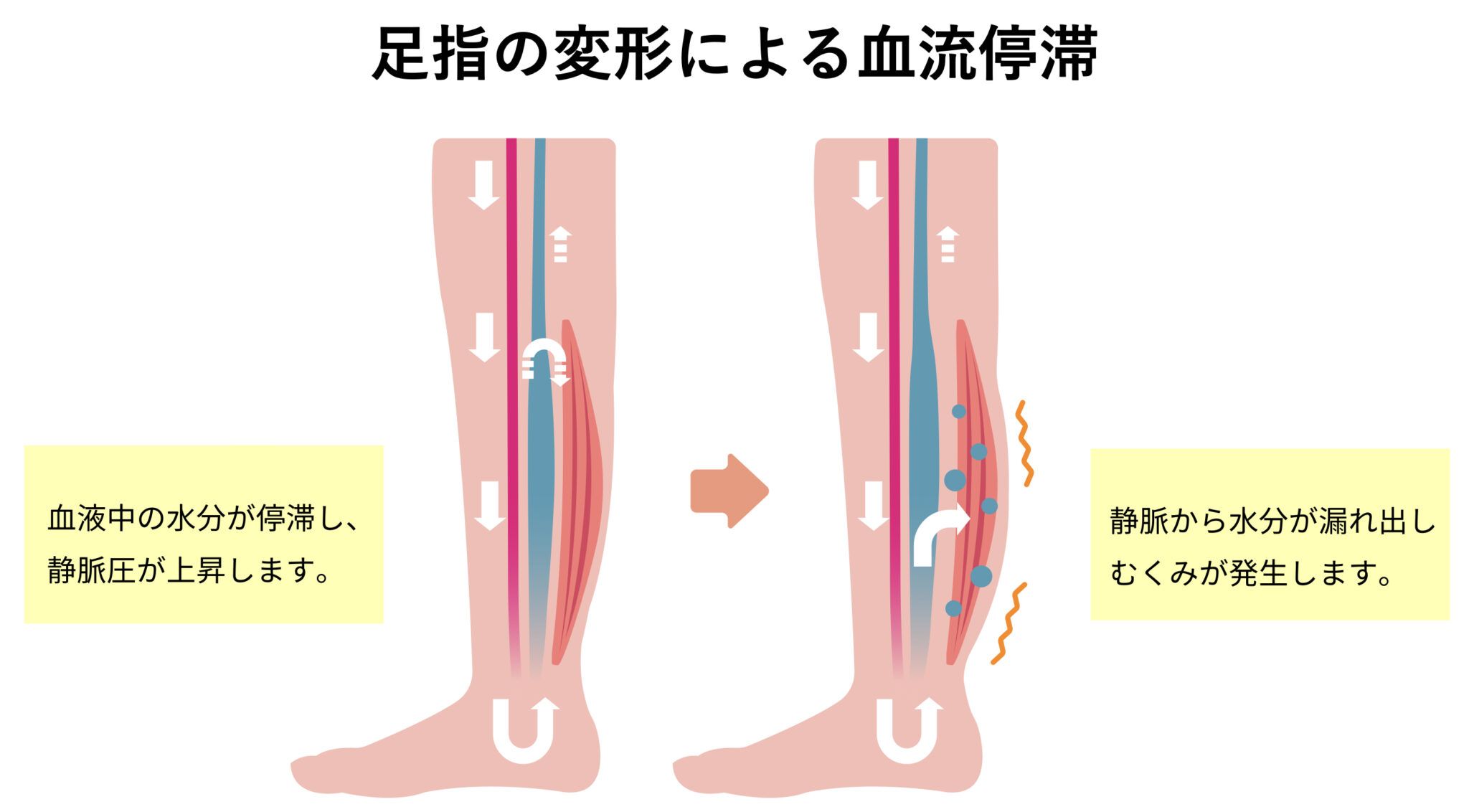 足指は本来の働きを失い、同時に血流の“通り道”も乱れます。