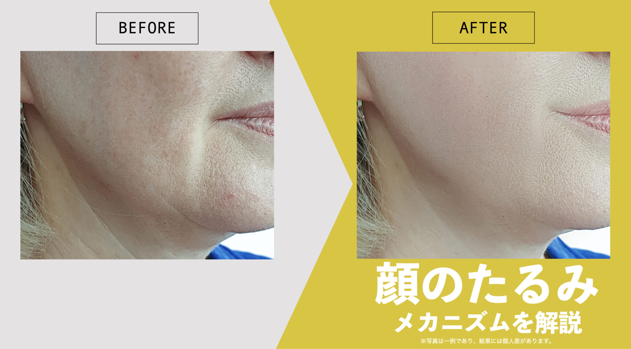 これにより 表情筋の張力の向きが“下方向”に偏る ため、
