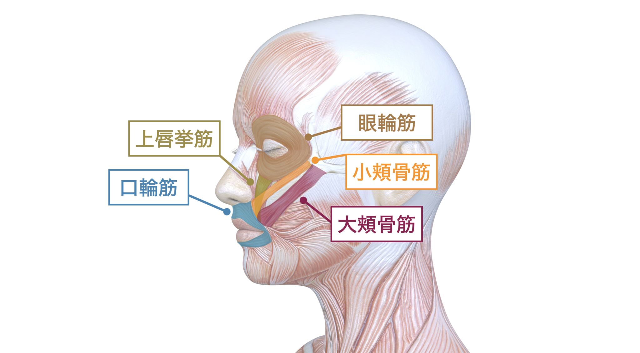 口角を引き上げる筋肉(大頬骨筋・笑筋)は、