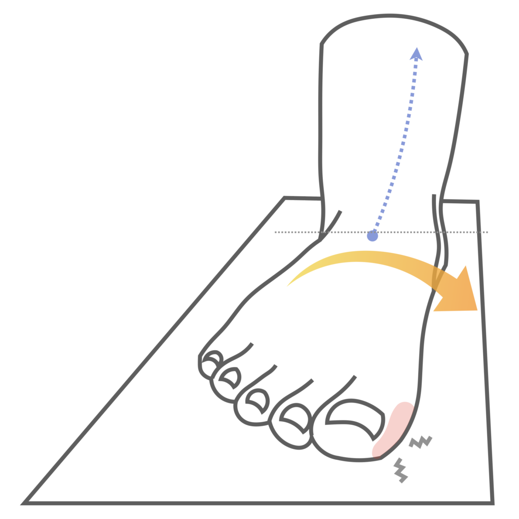 また、歩行時には、足にかかる力が正しく分散されることが重要です。親指が変形して内側に重心がかかると、歩行時に足が内側に流れる力が働きます。これにより、足の内旋が助長されます 。