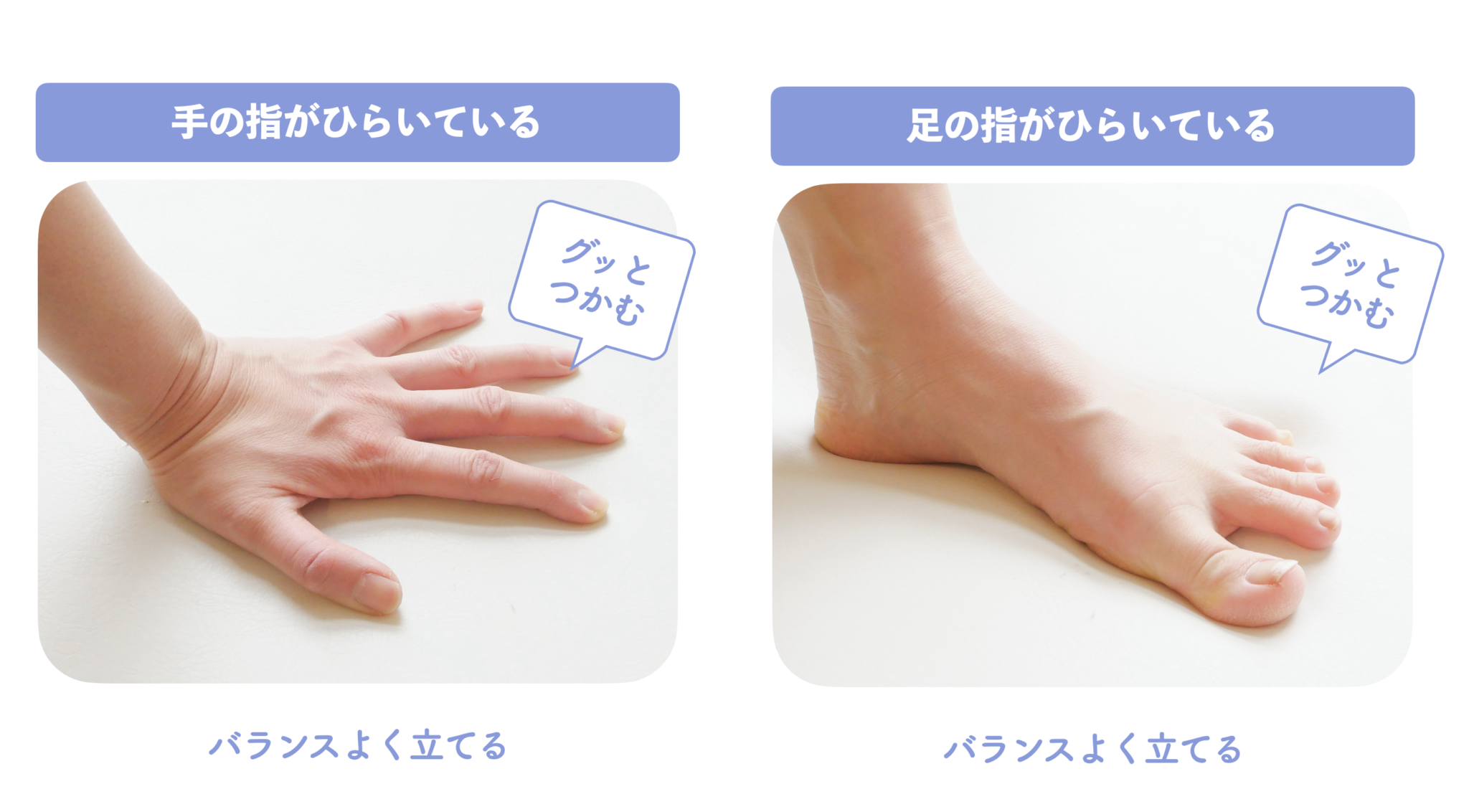 人が立つ時の状態を、逆立ちに置き換えて考えてみましょう。逆立ちするとき、手の形はどうしますか?手の指を大きく広げ、まっすぐ伸ばしているはずです。手の指が閉じていたり、曲がっていたら、腕に力が入らなかったり、バランスが悪くなって逆立ちはできなくなります。
