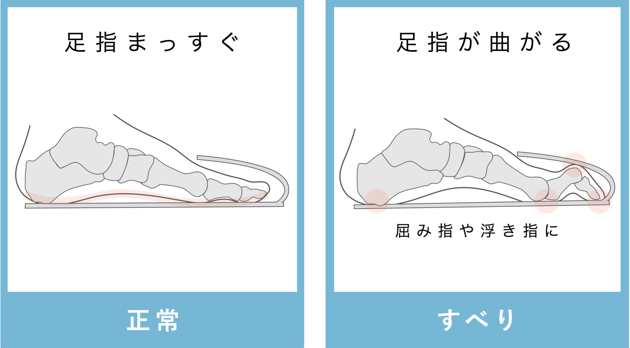 足も手の指と同じで、それぞれの指に役割があります。バランスを崩して姿勢が崩れそうになった時には、親指や小指の機能が働き、体のバランスを元の位置に戻そうとします。しかし指が曲がっている状態では足指の機能がうまく働かないので、体のバランスを元の位置に戻すことができなくなるのです。
