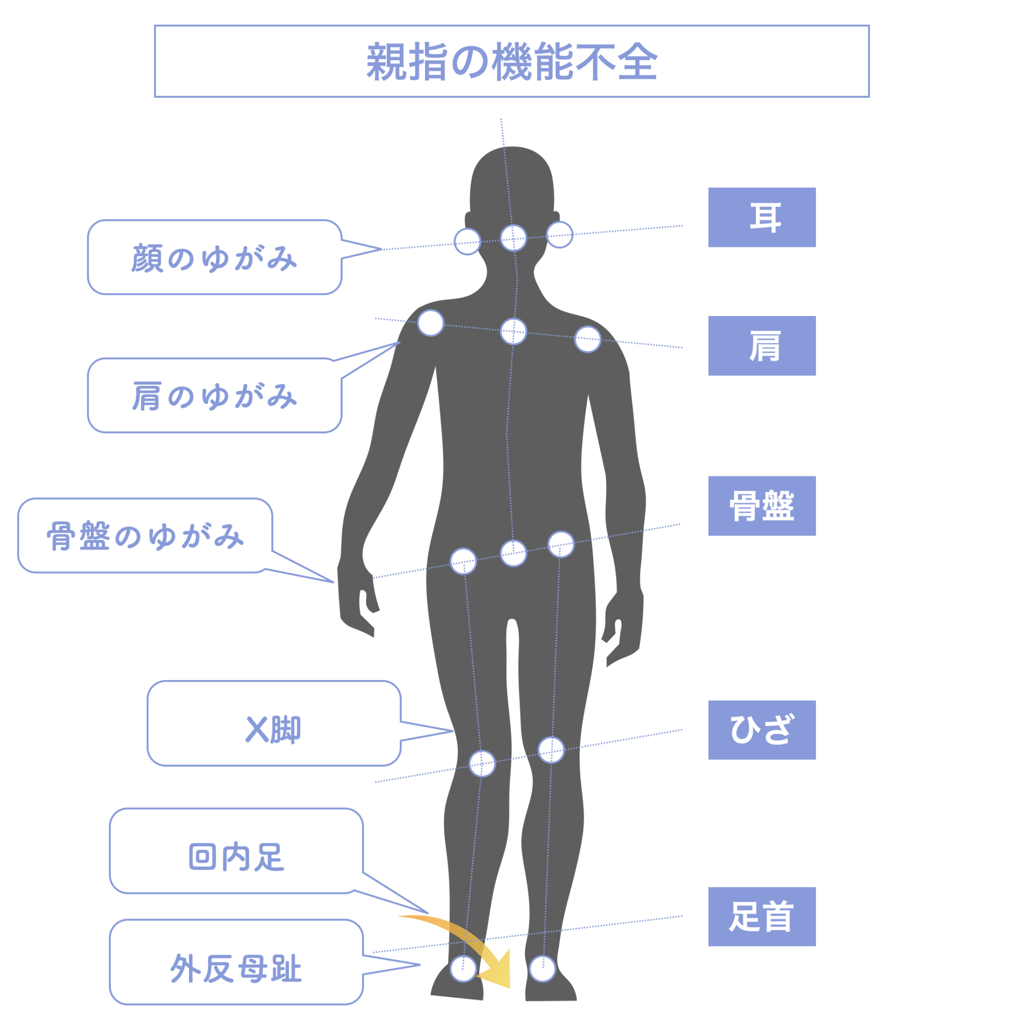 真正面からの姿勢も同様です。親指や小指の機能不全、外反母趾や内反小趾になると、足裏の中心にあった重心が「外側」や「内側」にかたよってしまいます。外側に片寄れば「O脚」、内側に片寄れば「X脚」になりやすいです。