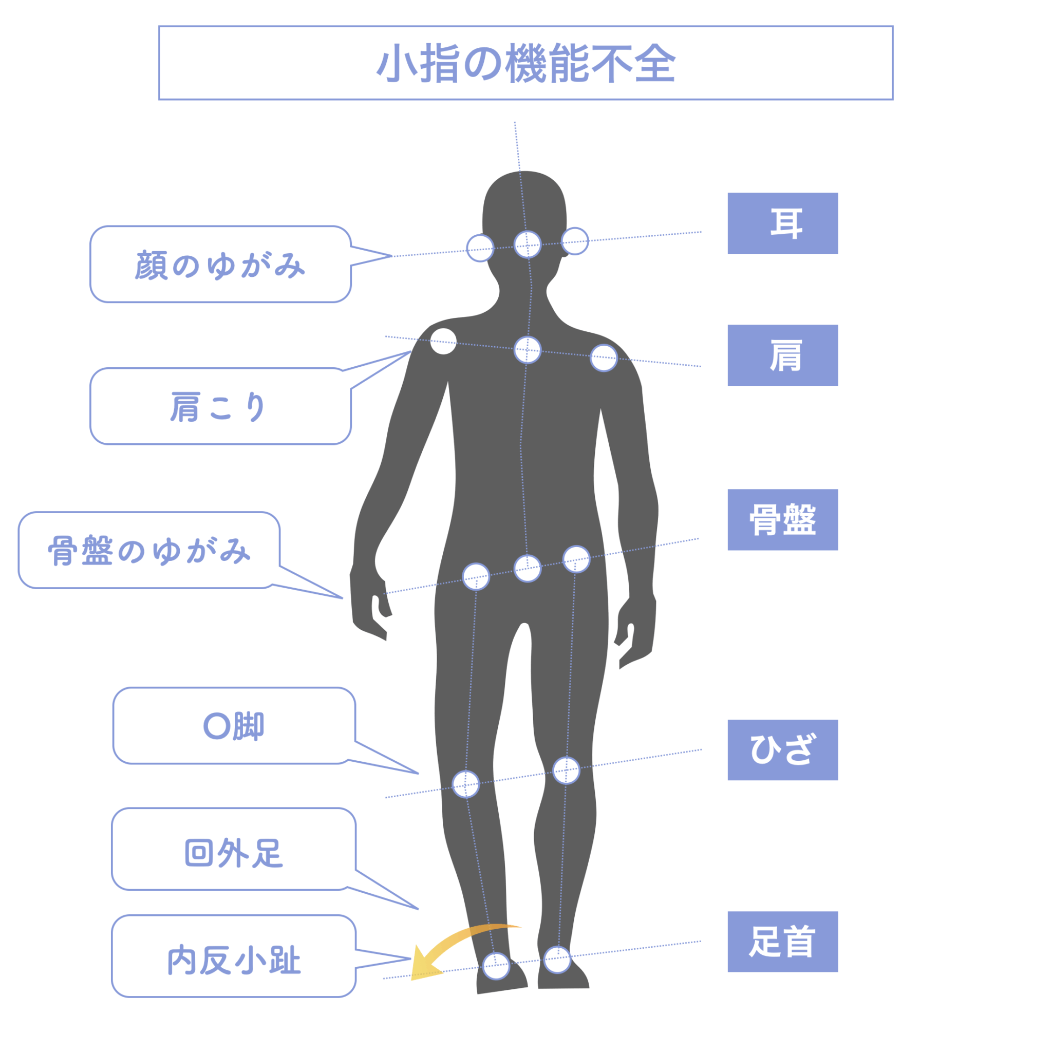 小指の変形や機能不全により、足の外側に重心がかかると、足底筋群(足の裏の筋肉群)と外旋筋(足を外側に回す筋肉群)が過剰に働くことになります。これにより、足の筋肉が不均衡に発達し、外旋する力が強まります。