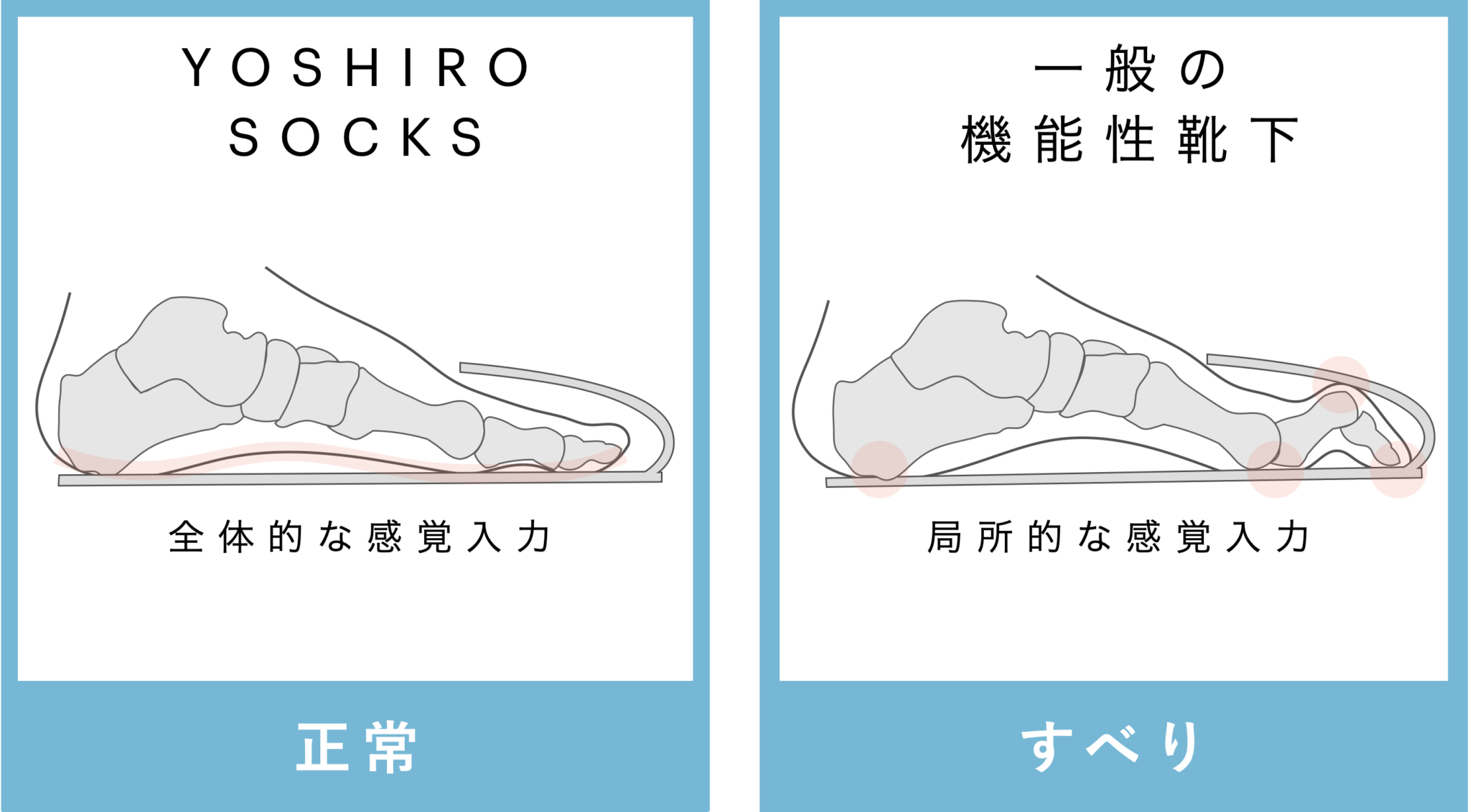 後者の靴下は、足趾や足裏の感覚入力が働きやすい環境づくりを目的とした構造で、その結果として、姿勢制御が行われやすい状態が生まれる可能性があります。