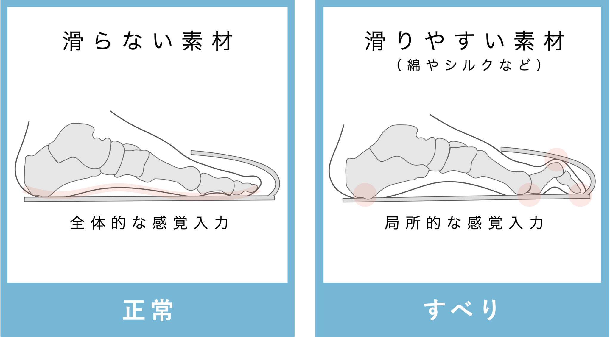 一般素材(綿・シルク・スポーツソックス)は 0.6〜0.9N と低摩擦で、靴内で足が滑りやすい特性があります。一方、特殊高摩擦素材(例:2.3N)は、足裏の相対滑りを大幅に減らし、姿勢フィードバックの安定性に寄与する可能性があります。