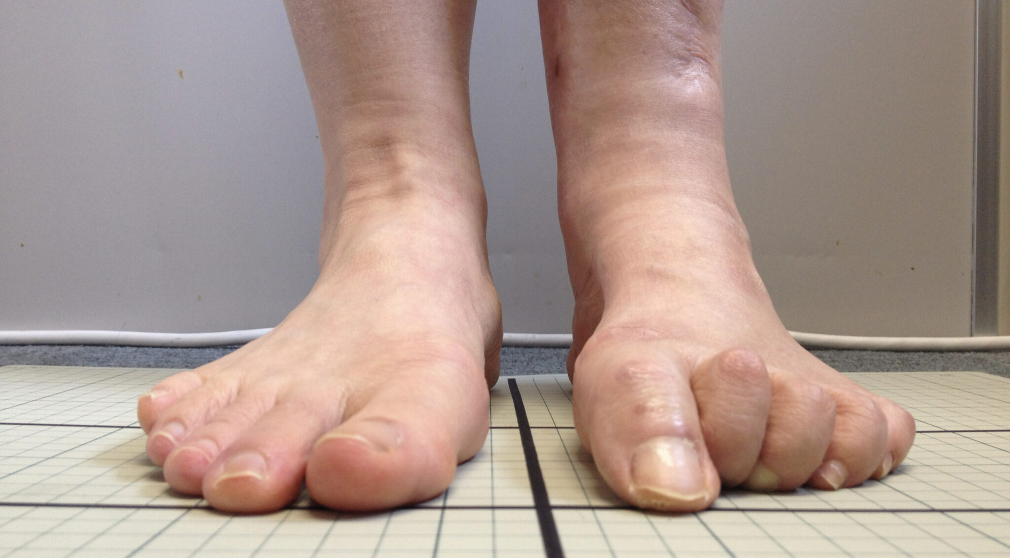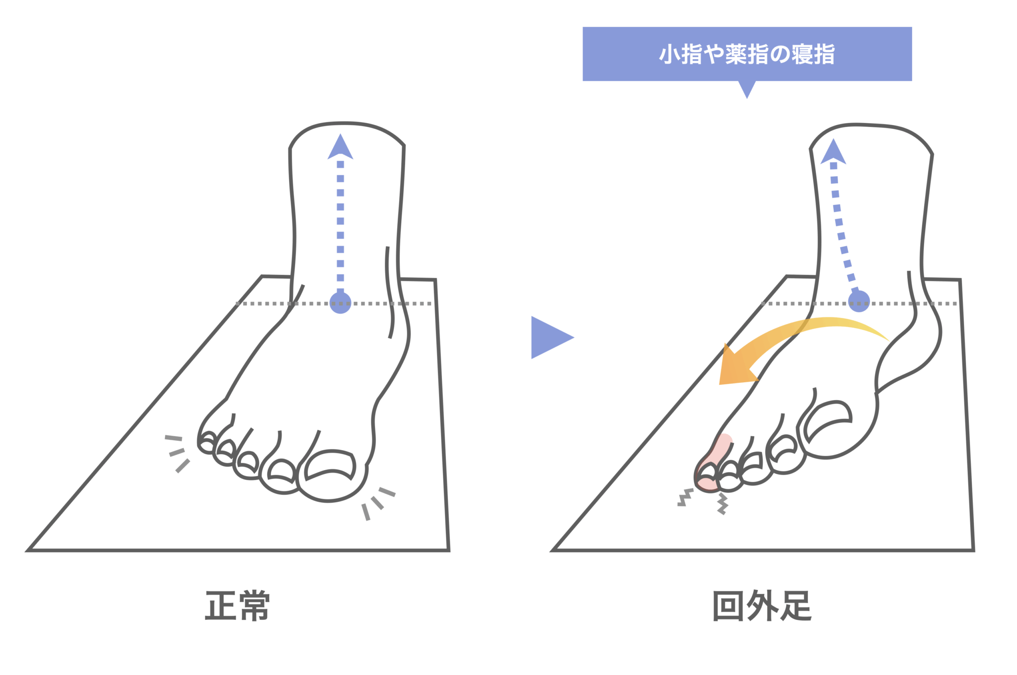とくに外反母趾との混在型で見られることが多く、母趾の機能不全により重心が外側に逃げ、その結果、小指が圧迫・外旋して寝指になるという悪循環が生まれます。