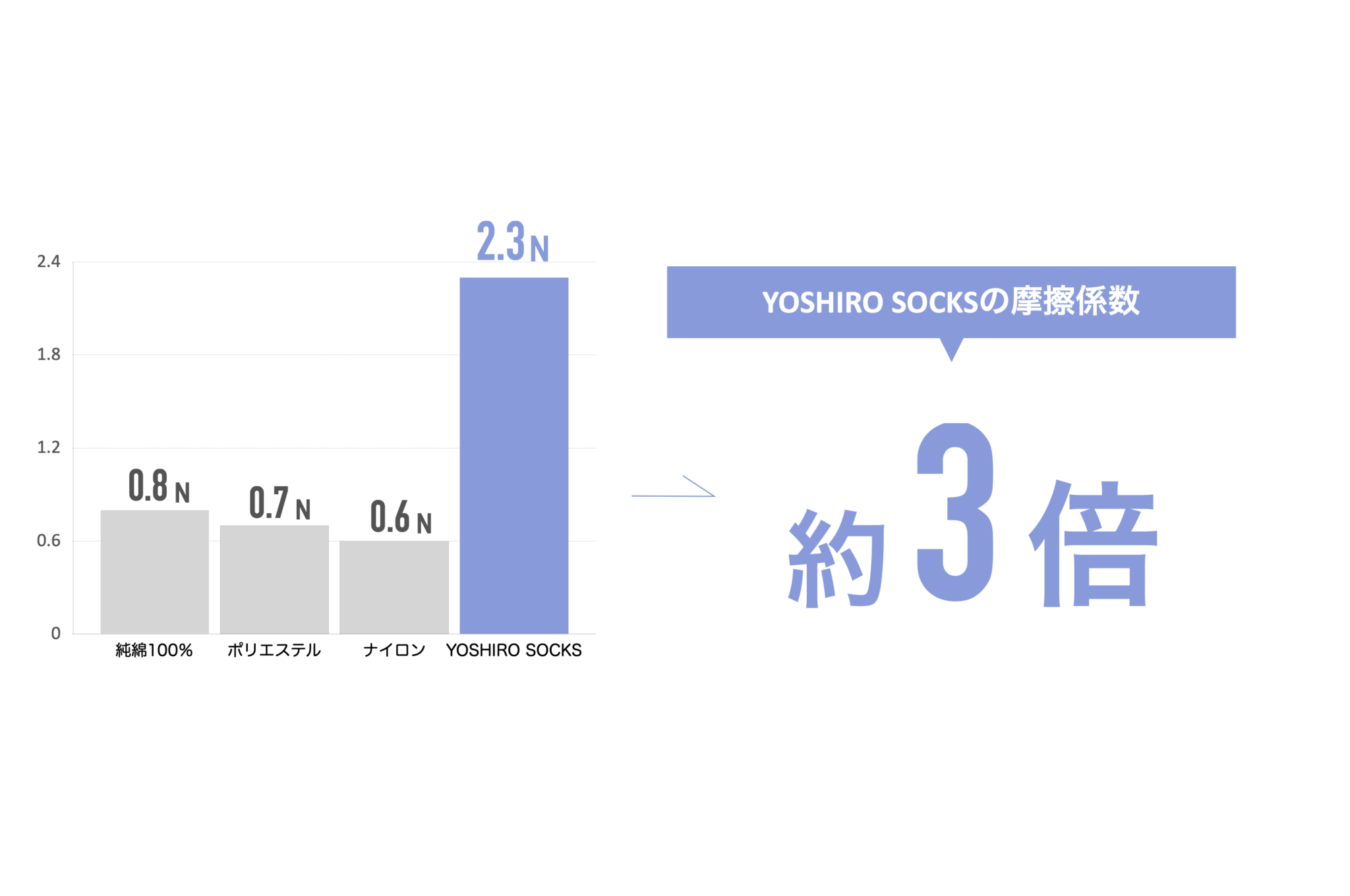 一般的な綿・ポリエステル系の靴下では摩擦力が0.6〜0.8N程度で、足が靴の中で滑りやすくなります。これに対し、私たちの開発したYOSHIRO SOCKSは、摩擦力2.3Nと高水準で設計され、足が靴や靴下内で滑ることなく安定し、足底感覚が高まり、足指の運動を自然に促します。