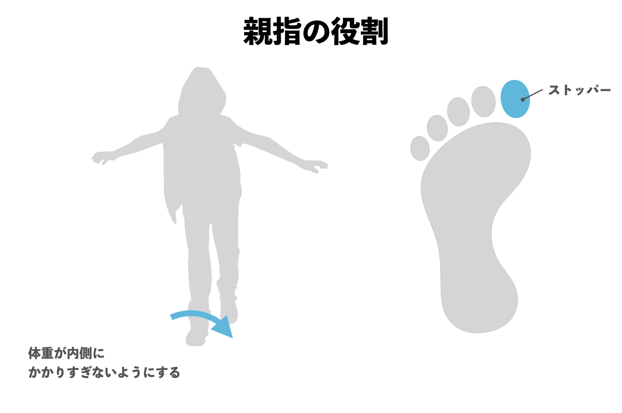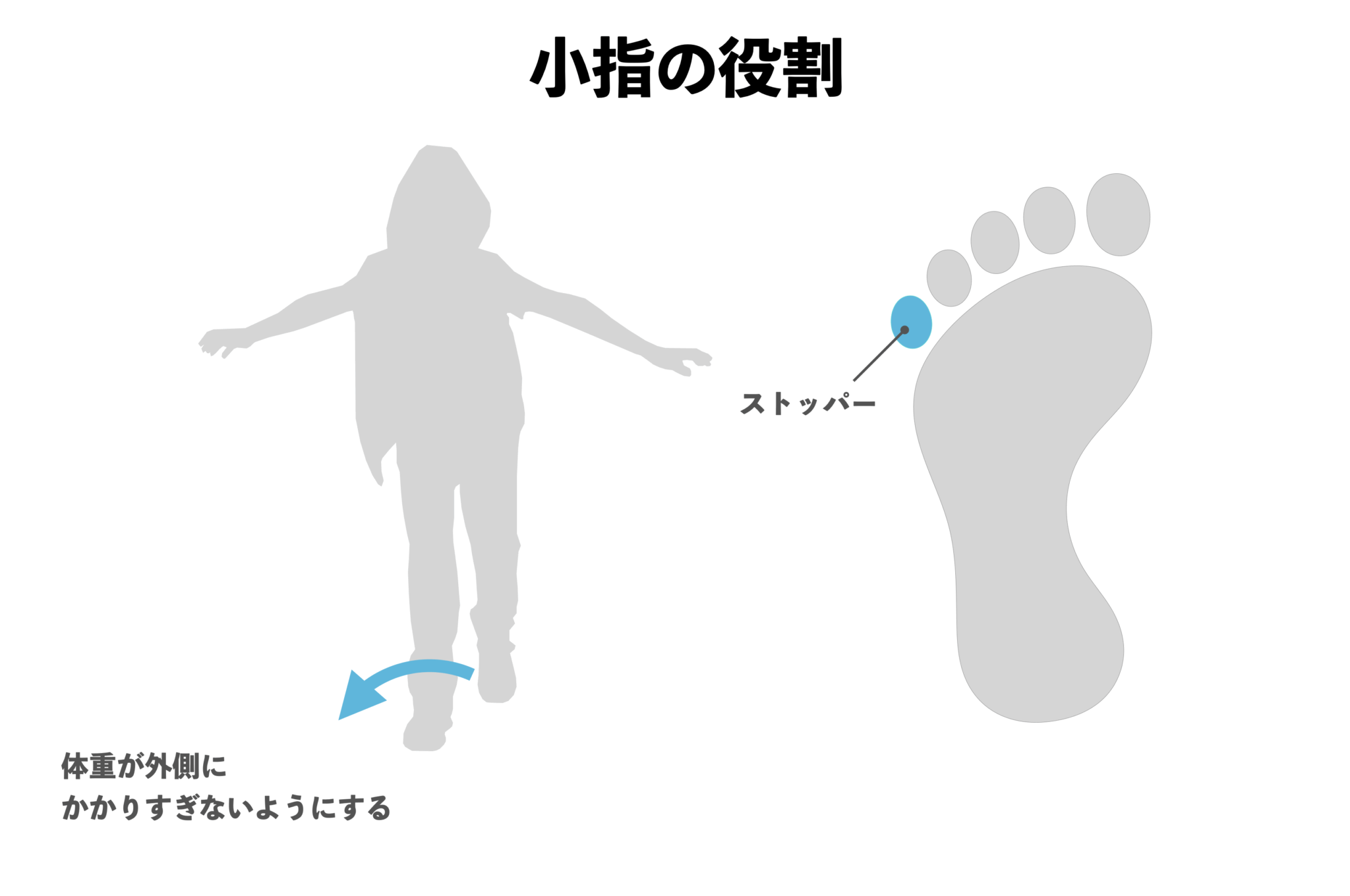 たとえば、親指は重心が内側に倒れるのを防ぎ、小指は外側へ倒れるのを防ぐ役割を持ちます。これらが機能しないと、膝や股関節、腰で無理に支えるしかなくなり、そこに痛みが発生します。