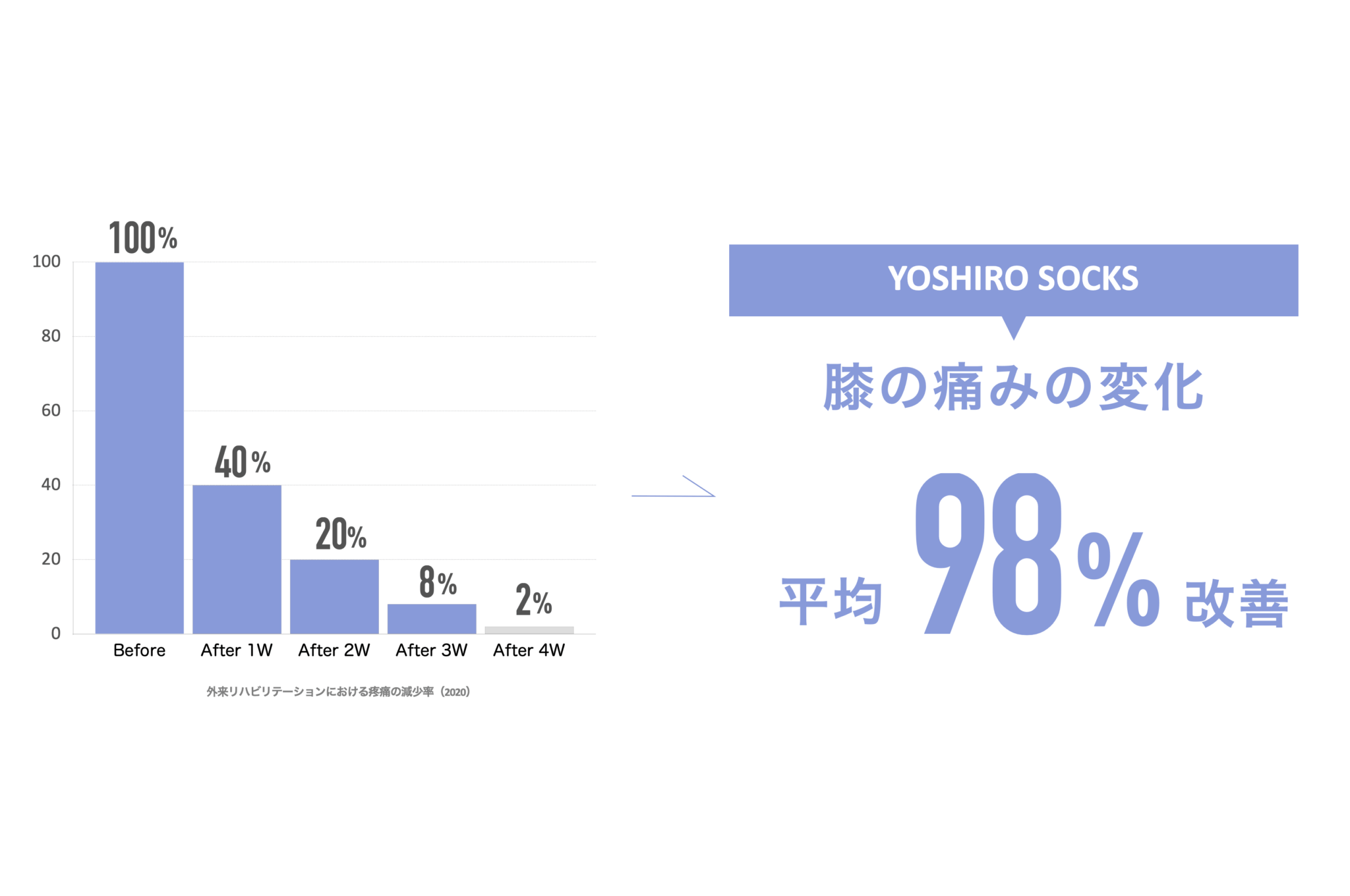 - YOSHIRO SOCKS装着8週間で、膝痛スコア(VAS)が平均98%改善