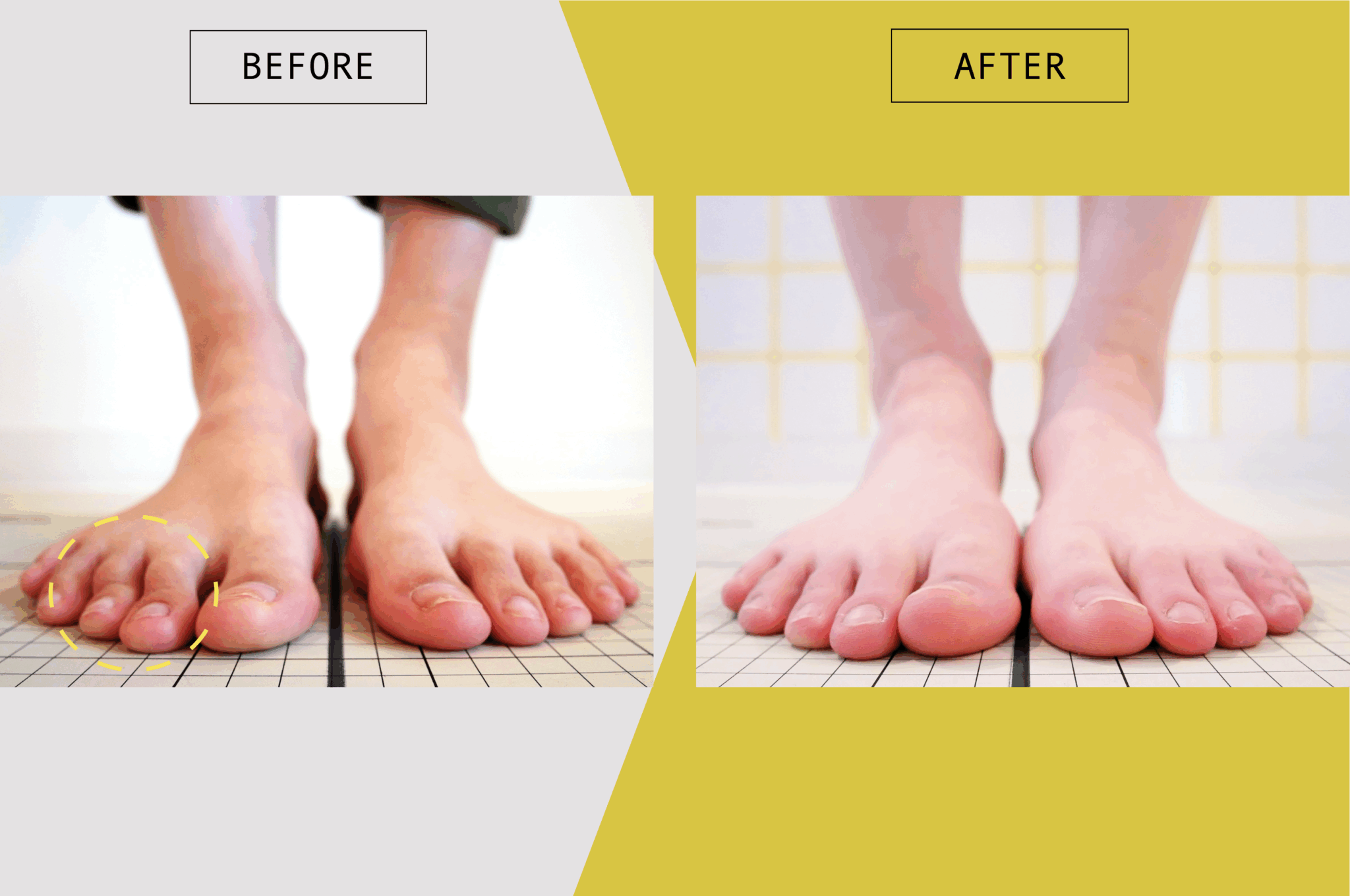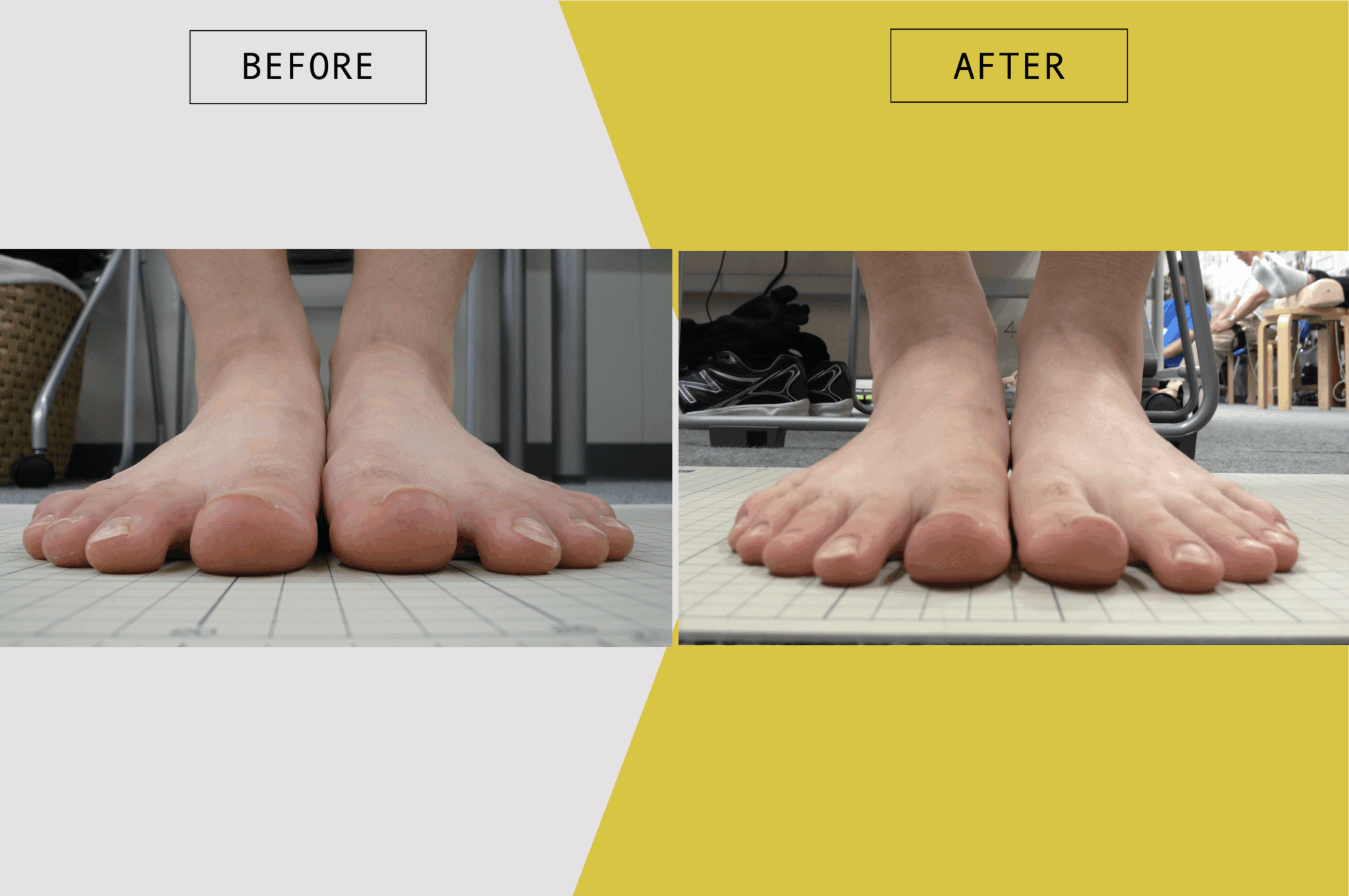 YOSHIRO SOCKSの効果は、単なる「使用者の主観的な感想」にとどまりません。私がこれまでの臨床で得てきた数々のデータに加え、東京大学名誉教授・石井直方氏との共同研究によって、足指の変形や可動域改善・姿勢アライメントの正常化・筋活動量の増加など、定量的にも変化が裏付けられています。