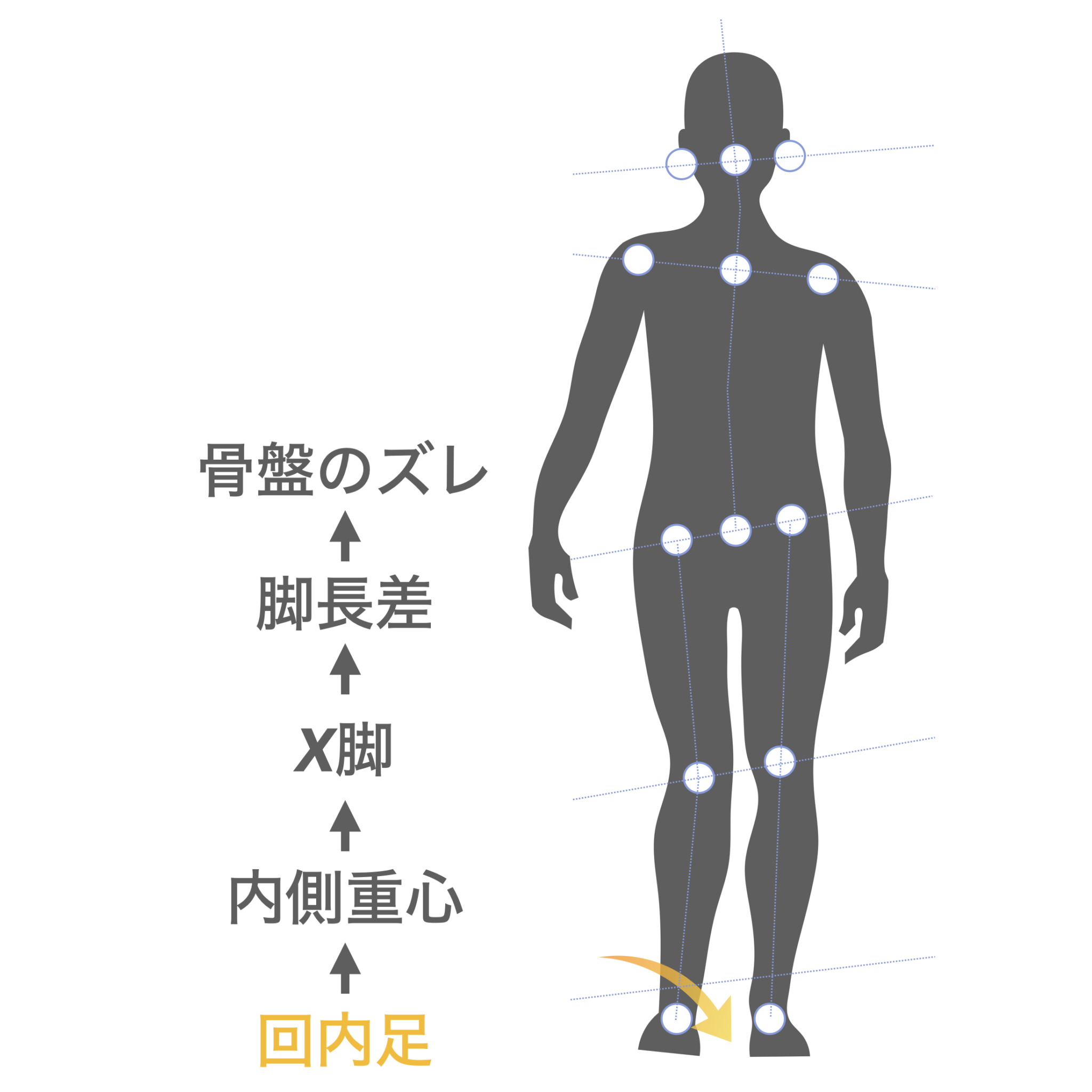 内側ルート(X脚側)|足指変形が“内側重心”を作り、仙腸関節で痛みが増幅する