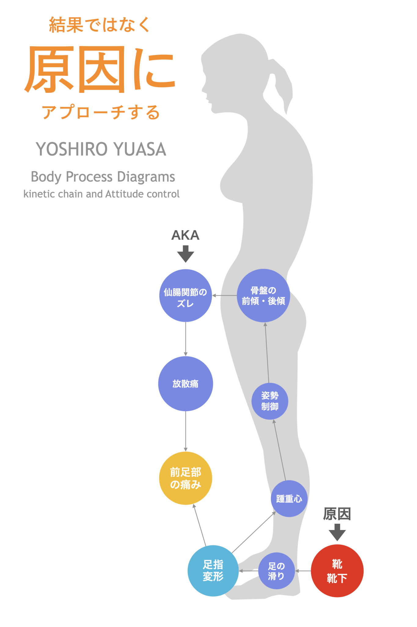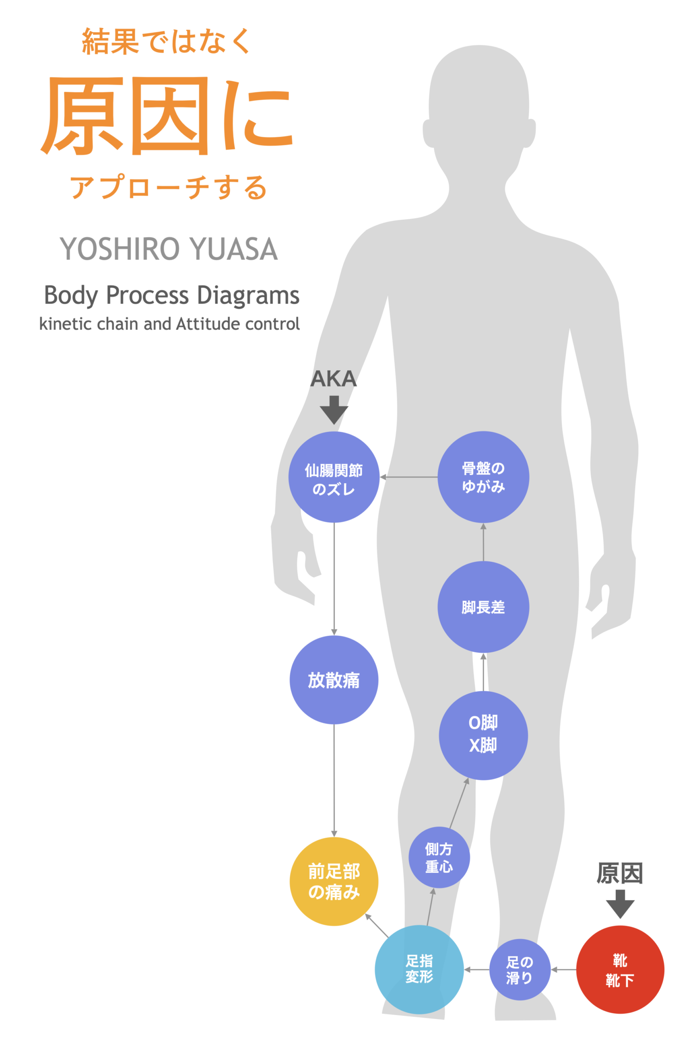 足指 → 重心 → 脚の軸 → 骨盤 → 仙腸関節 → 痛み