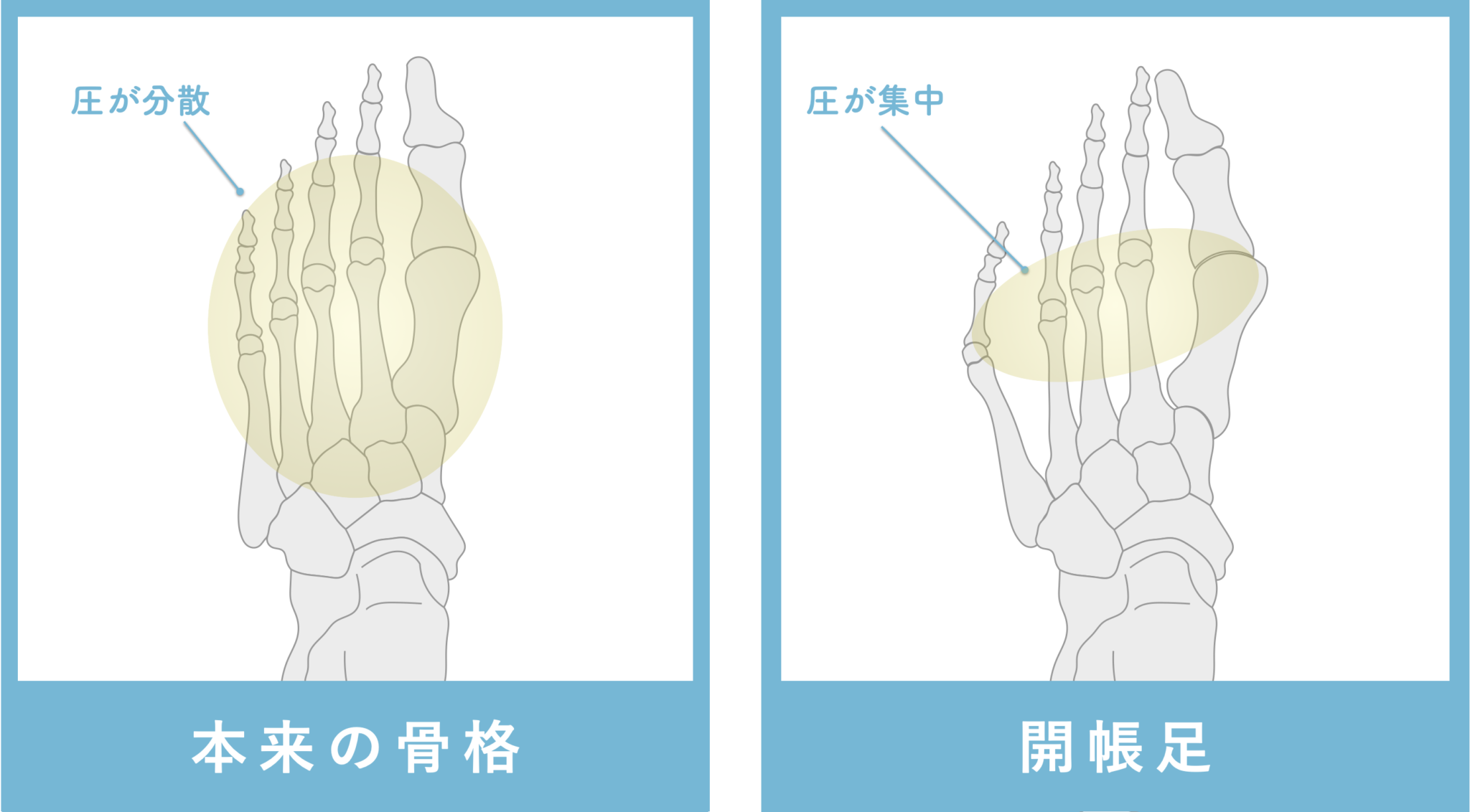 足の骨格を支える筋肉は、全ての足指を使って歩くからこそ鍛えられ続けるからです。足指が均等に使えず、足の筋肉が弱れば、足の骨格は支えを失い、開帳足や扁平足となっていきます。それが結果として前足部の圧の集中を招いてしまいます。