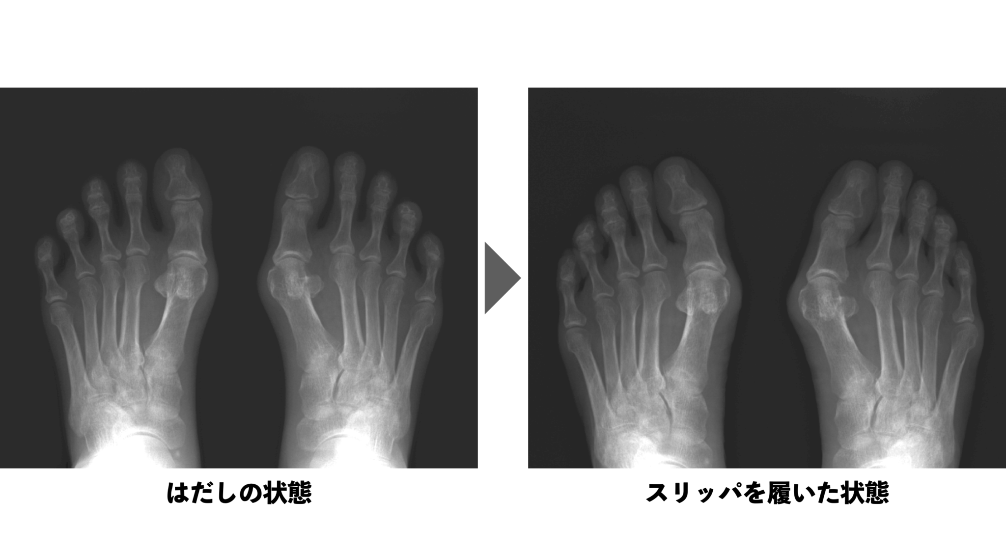 そうすると足趾の支持力が失われ、足裏全体で体重を受け止められなくなるため、筋力の低下と横アーチの崩壊が加速していきます。