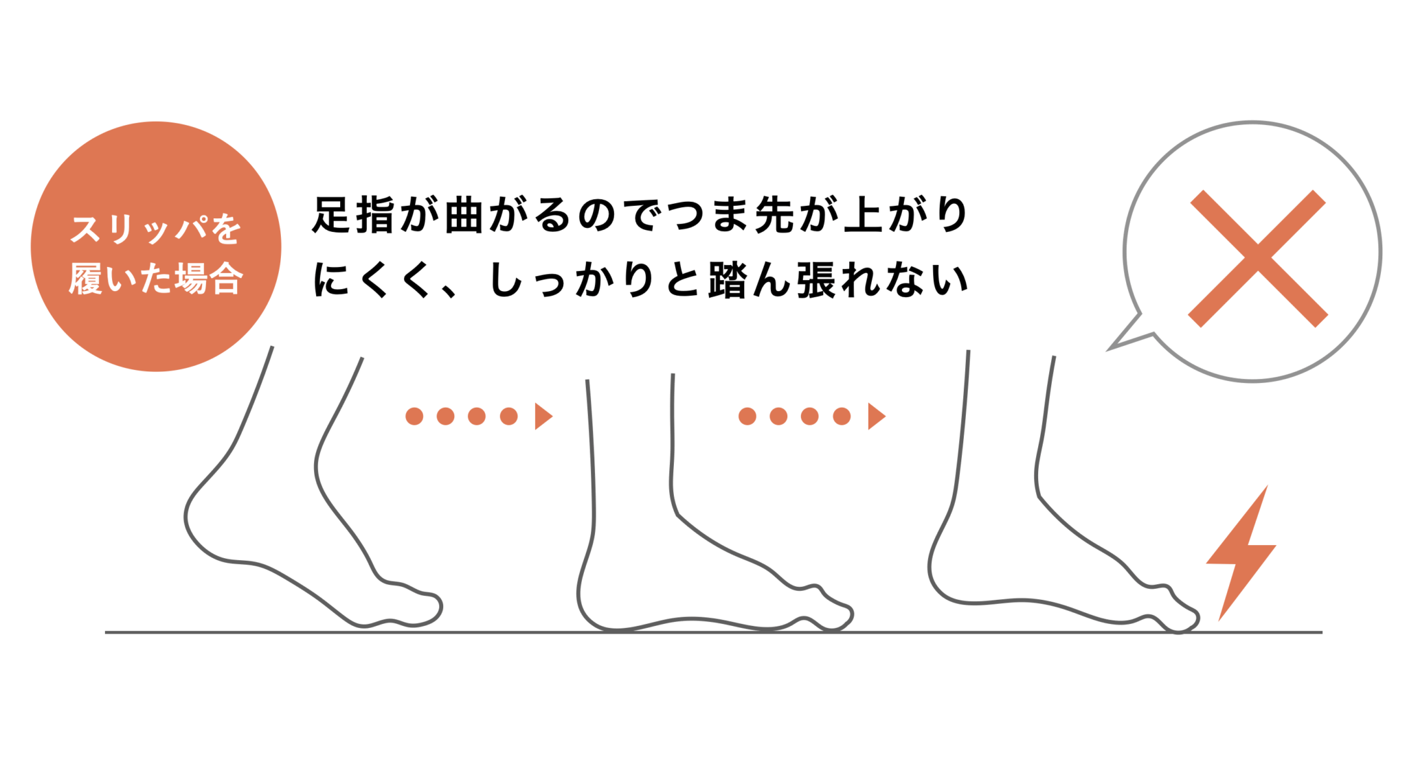 スリッパを履いた歩行では、かかとが固定されていないため、足が前にすべりやすい状態になります。すると、足が脱げないようにするために、つま先を上げる角度や膝・股関節の動かし方が変化し、歩行パターンが通常とは異なる方向に向きやすくなります。