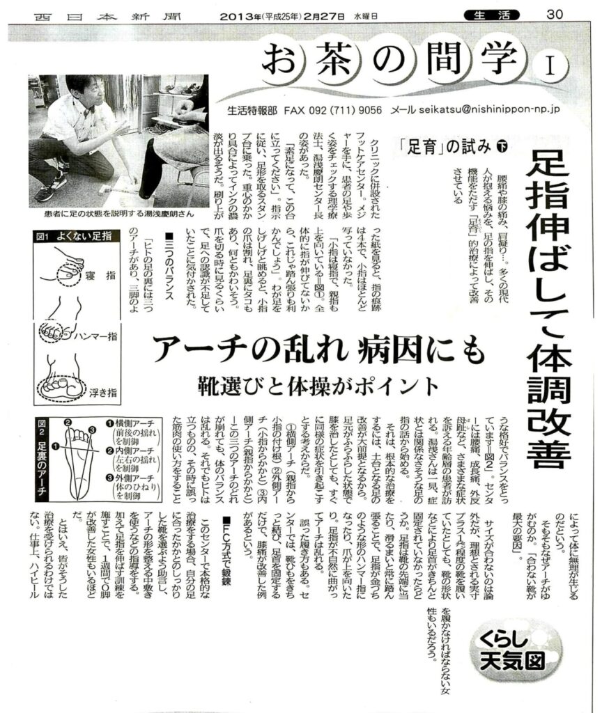 西日本新聞掲載|足の問題は万国共通 2013年10月2日、西日本新聞の生活面「お茶の間学Ⅱ」に掲載された記事です。 この記事では、足のトラブルが日本だけでなく世界中で見られる問題であることについて紹介されています。 足の形や足指の機能に合わない靴を... -