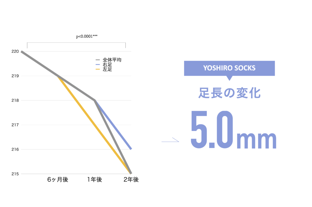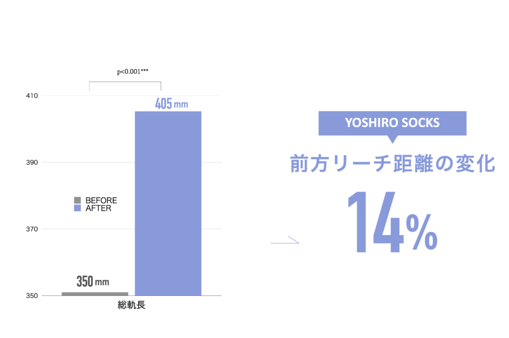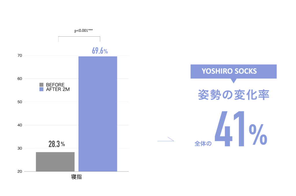 YOSHIRO SOCKSは、関節にかかる負担の変化に関して、データ上で一定の傾向が示されています。足指を広げて伸ばし、足裏からの感覚入力を得やすい状態をつくることで、姿勢の安定性や体全体のバランスに変化が生じる可能性があります。その結果、関節への不要な負担のかかり方に変化がみられ、膝や腰まわりの違和感の感じ方に影響を与える可能性が示唆されます。
