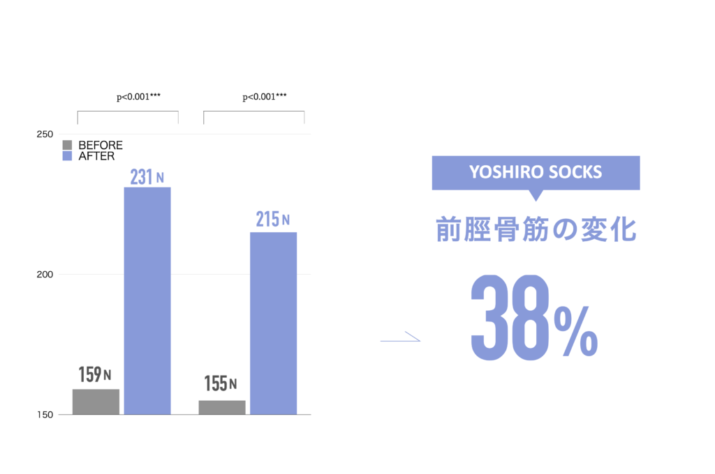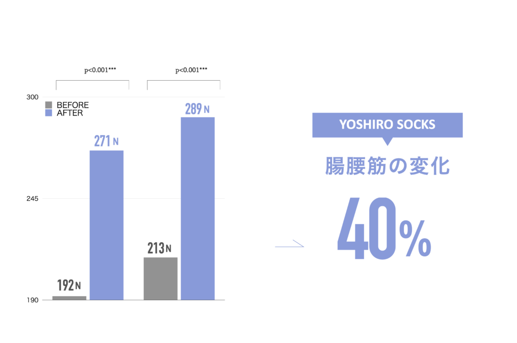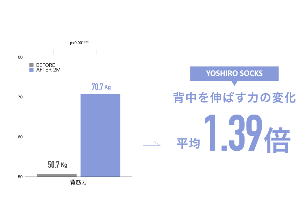 YOSHIRO SOCKS装着後の平均値は、開始時と比べて、背筋力が平均39%(最大57%)の変化がみられました。
