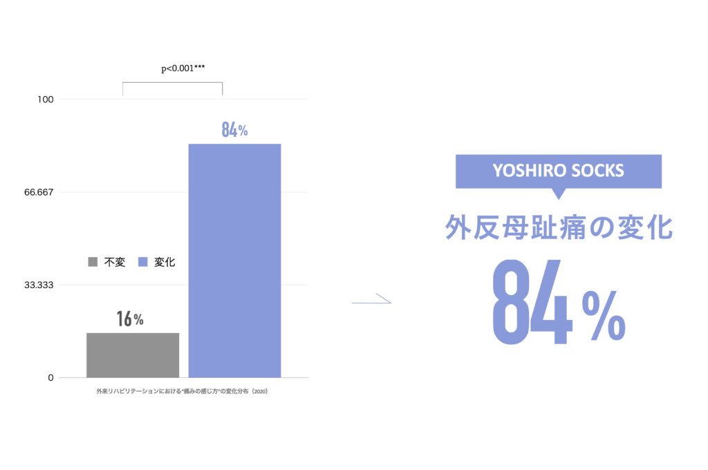 2週間後の評価では、開始時と比べて、外反母趾痛の感じ方に変化がみられた割合は84%でした。